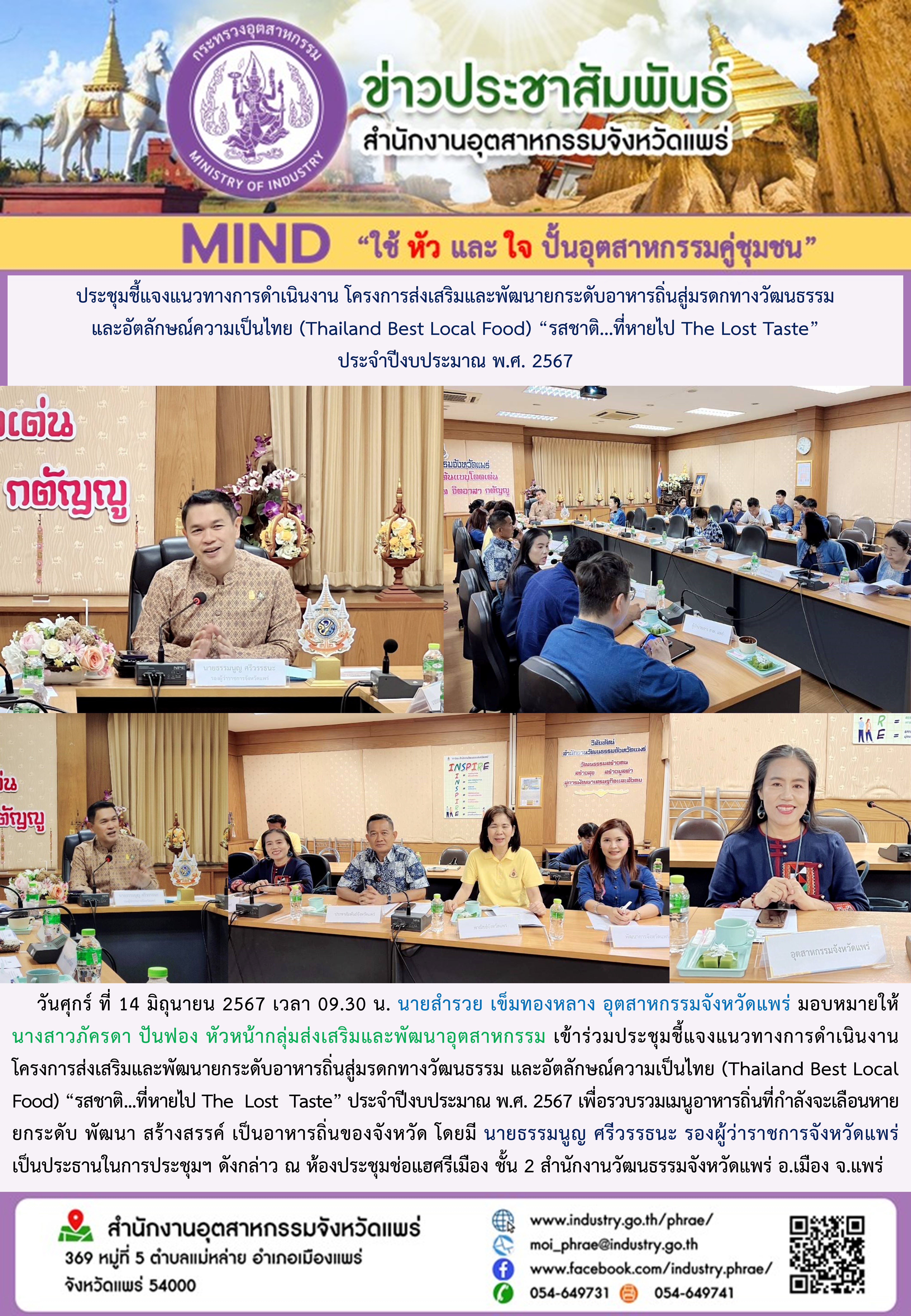 วันศุกร์ ที่ 14 มิถุนายน 2567 เวลา 09.30 น. นายสำรวย เข็มทองหลาง อุตสาหกรรมจังหวัดแพร่ มอบหมายให้นางสาวภัครดา ปันฟอง หัวหน้ากลุ่มส่งเสริมและพัฒนาอุตสาหกรรม เข้าร่วมประชุมชี้แจงแนวทางการดำเนินงาน โครงการส่งเสริมและพัฒนายกระดับอาหารถิ่นสู่มรดกทางวัฒนธรรม และอัตลักษณ์ความเป็นไทย (Thailand Best Local Food) “รสชาติ...ที่หายไป The Lost Taste” ประจำปีงบประมาณ พ.ศ. 2567 เพื่อรวบรวมเมนูอาหารถิ่นที่กำลังจะเลือนหาย ยกระดับ พัฒนา สร้างสรรค์ เป็นอาหารถิ่นของจังหวัด โดยมี นายธรรมนูญ ศรีวรรธนะ รองผู้ว่าราชการจังหวัดแพร่ เป็นประธานในการประชุมฯ ดังกล่าว ณ ห้องประชุมช่อแฮศรีเมือง ชั้น 2 สำนักงานวัฒนธรรมจังหวัดแพร่ อ.เมือง จ.แพร่