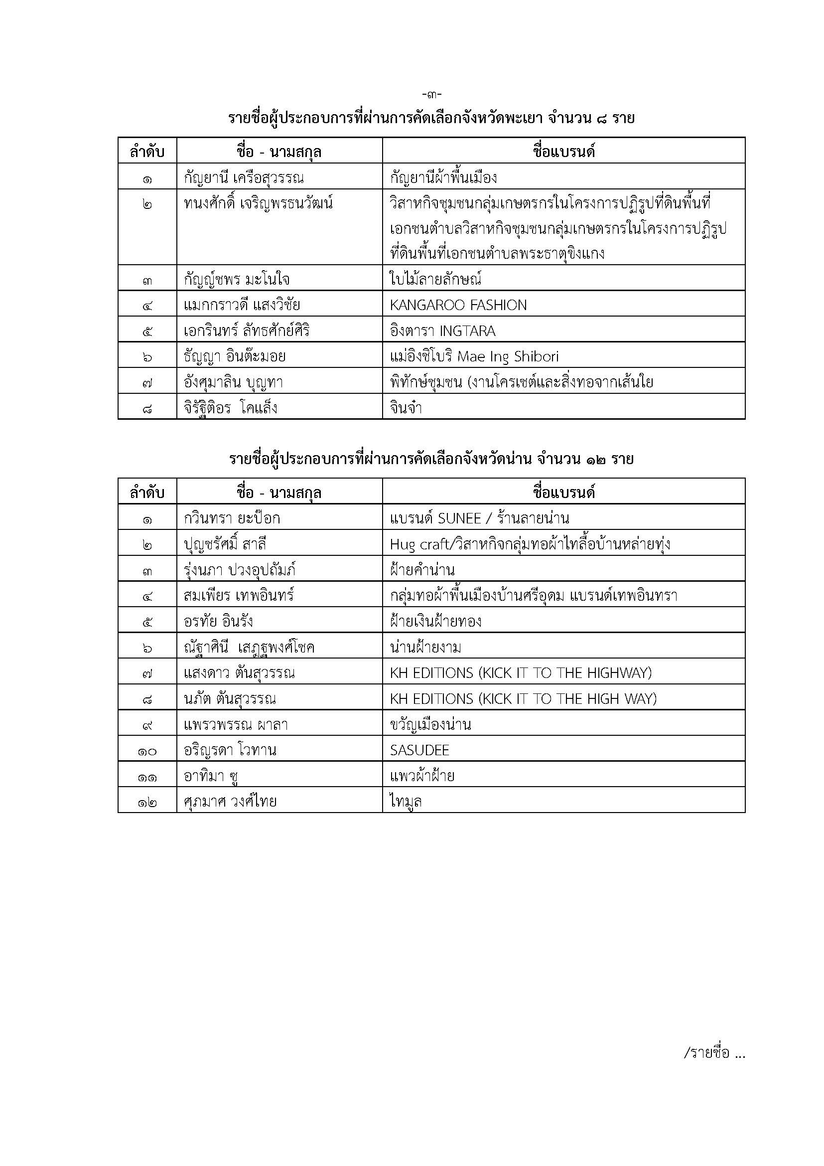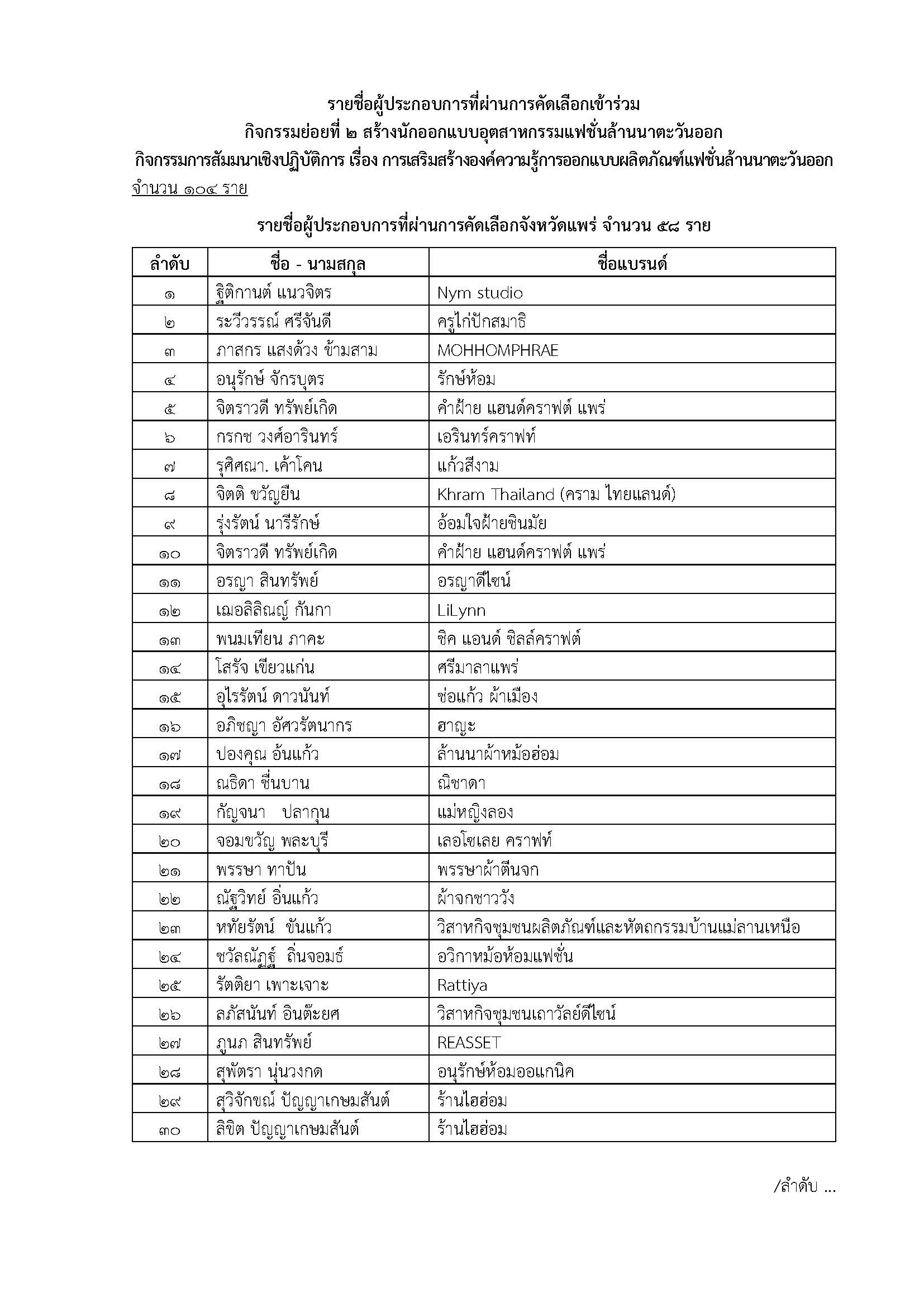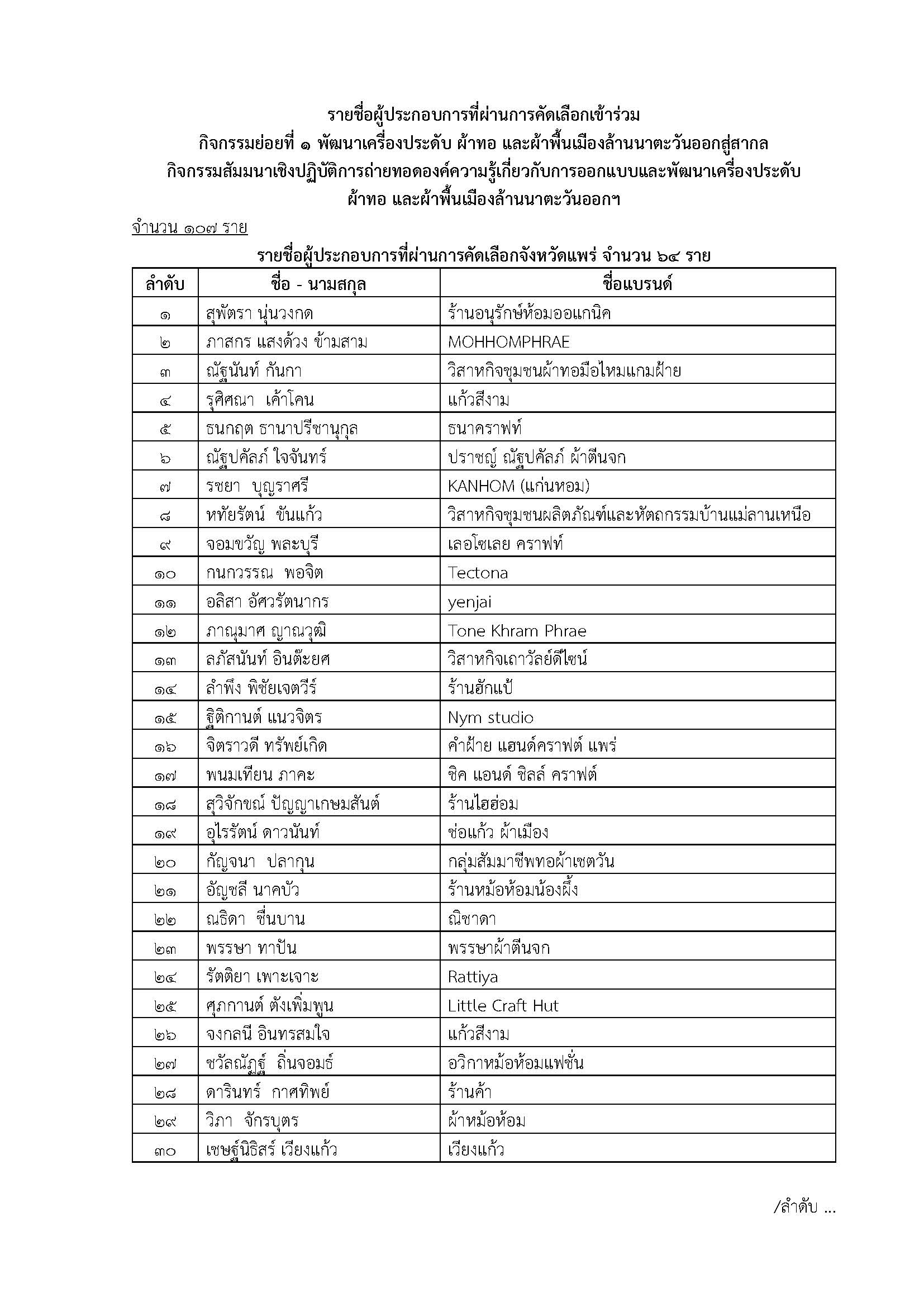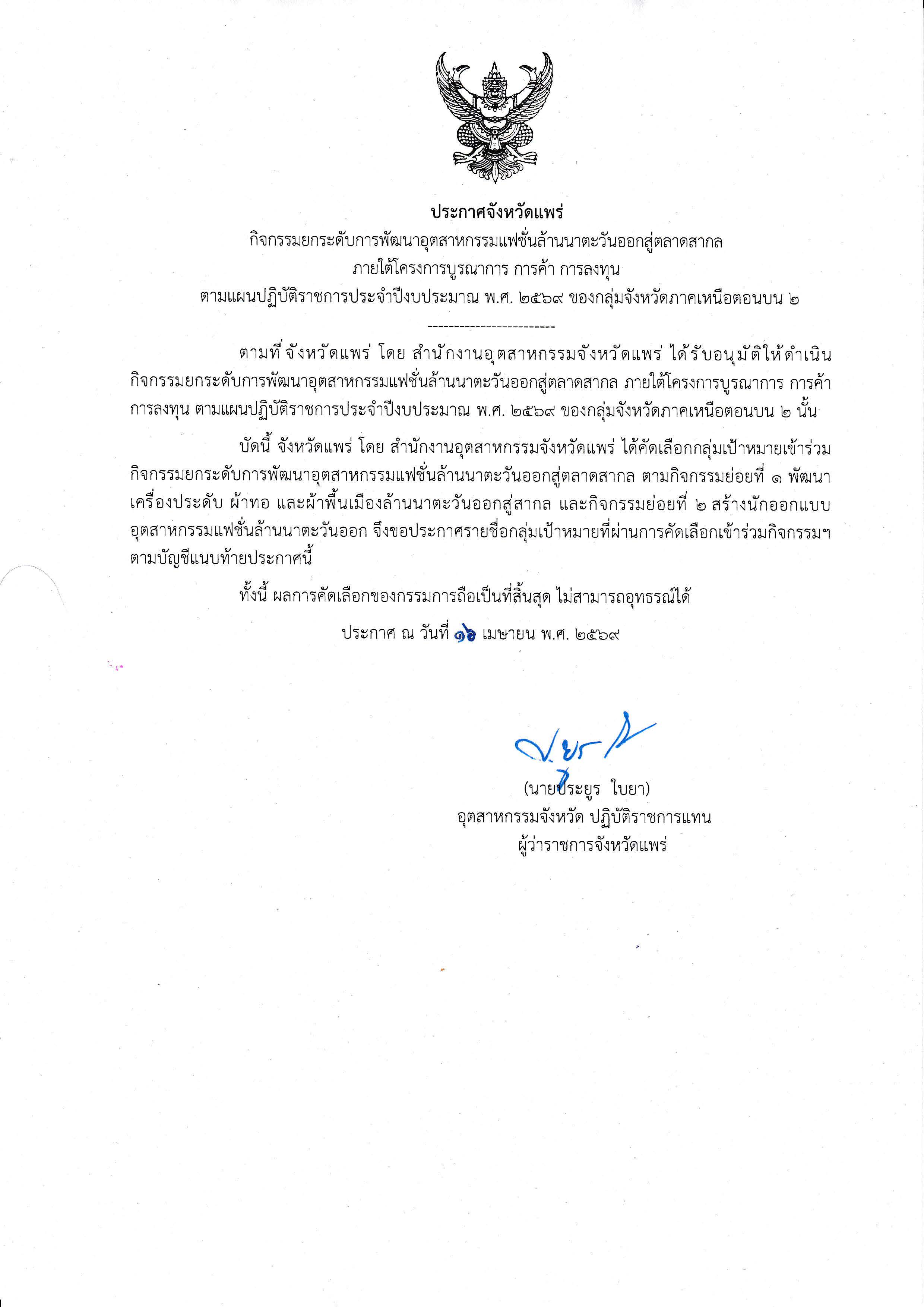 ประกาศจังหวัดแพร่ โดย สำนักงานอุตสาหกรรมจังหวัดแพร่ ได้คัดเลือกกลุ่มเป้าหมายเข้าร่วมกิจกรรมยกระดับการพัฒนาอุตสาหกรรมแฟชั่นล้านนาตะวันออกสู่ตลาดสากล ฯ