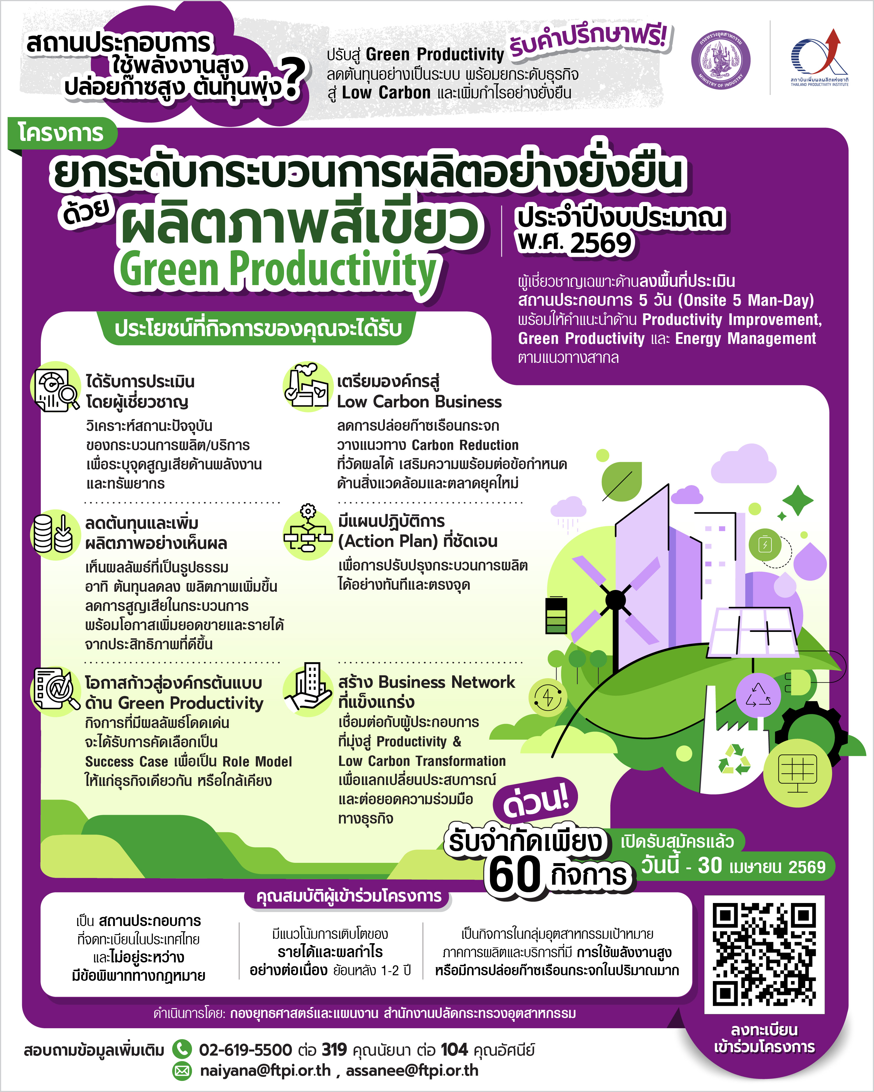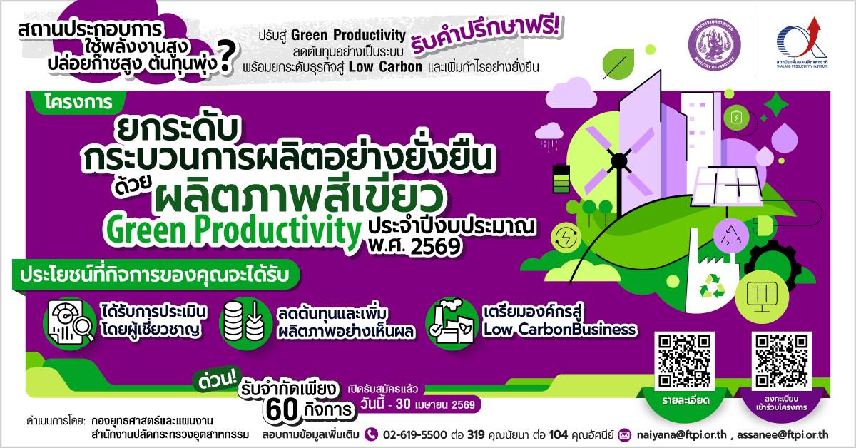 สำนักงานอุตสาหกรรมจังหวัดแพร่ ขอเชิญ ผู้ประกอบการ สมัครเข้าร่วมโครงการยกระดับขบวนการผลิตอย่างยั่งยืนด้วยผลิตภาพสีเขียว (Green Productivity)